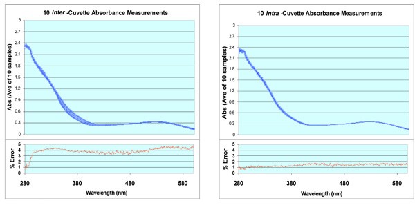 図1は、純水ブランクに対して比較した同じワインのサンプルが入った10枚の異なるキュベットです。図2は、同じ水のブランクを使って同じワインを10回繰り返し測定したものです。